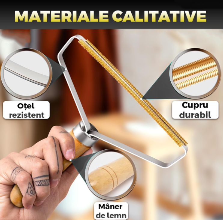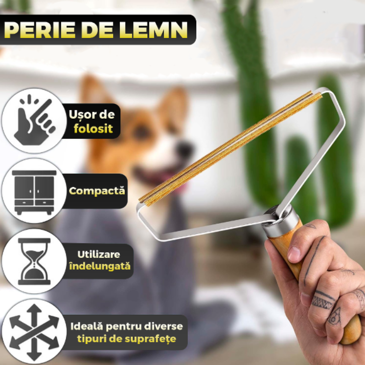Peria de lemn din acest kit este realizata din materiale de inalta calitate, cum ar fi otelul rezistent si cuprul durabil. Aceasta este ideala pentru diverse tipuri de suprafete, inclusiv blana si piele. Indiferent de suprafata pe care o curatati, aceasta perie asigura o curatare eficienta si delicata, mentinand integritatea materialului.